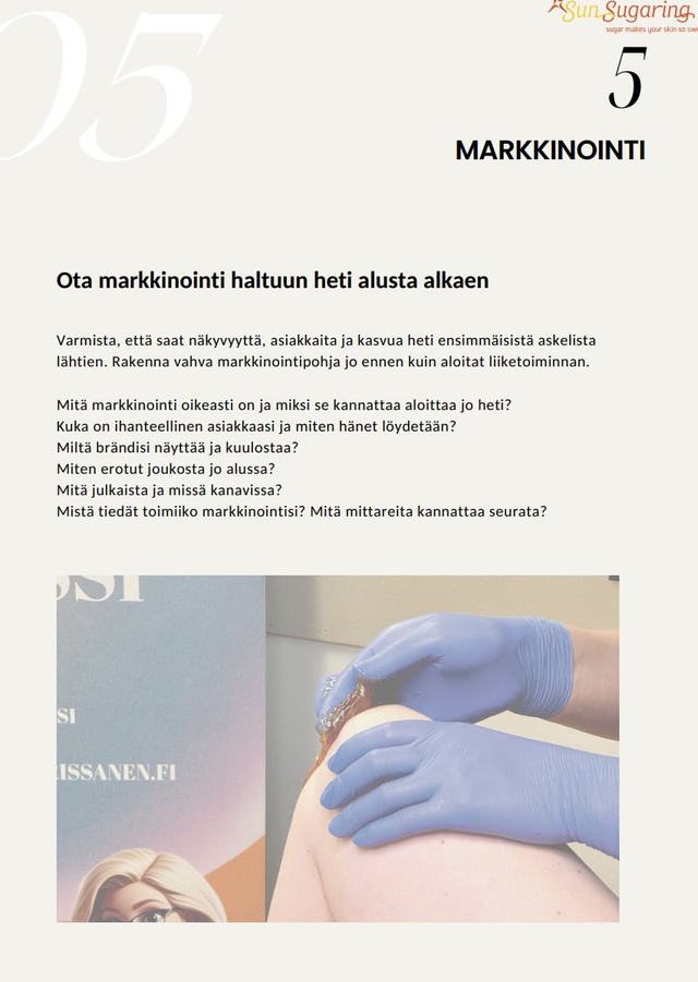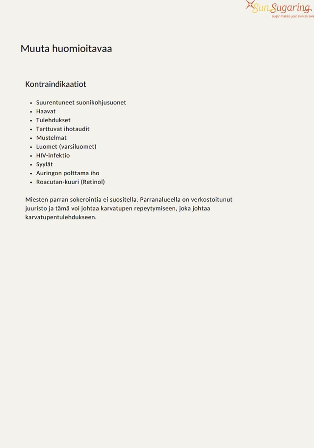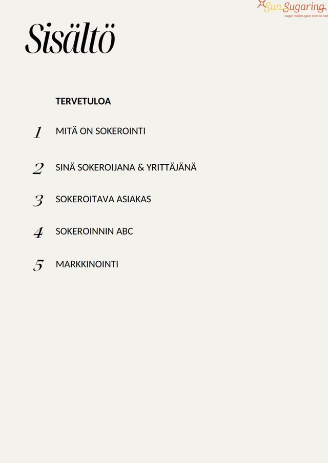 Tämä materiaali on suunniteltu ammattilaisille ja sokeroinnista kiinnostuneille, jotka haluavat ymmärtää sokeroinnin perusteet, työtavat ja vinkit tehokkaaseen ja turvalliseen työskentelyyn - ja lisäksi kehittää omaa liiketoimintaansa.